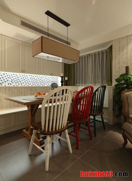 美式风格的装饰往往都会带给人们一种安静的感觉,空间内的色彩搭配会以淡雅、素净为主,整体的装饰效果可以带给人们一种舒适感,但并不代表空间内不会添加个性装饰,偶尔的装饰物品做点缀也可以使空间气氛显得十分活跃。 本套餐厅装饰中空间内的色彩搭配主要是以白色为主,石膏板吊顶的设计也比较简洁,原本单调的设计在搭配上吊灯后显得十分别致,也将吊灯的衬托的更加别致并附有时尚感。 更多»推荐家装效果图
