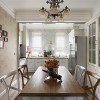 本套餐厅装饰中空间内的色彩搭配主要是以白色为主,石膏板吊顶的设计也比较简洁,原本单调的设计在搭配上吊灯后显得十分别致,也将吊灯的衬托的更加别致并附有时尚感。