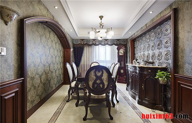美式风格的装饰往往都会带给人们一种安静的感觉,空间内的色彩搭配会以淡雅、素净为主,整体的装饰效果可以带给人们一种舒适感,但并不代表空间内不会添加个性装饰,偶尔的装饰物品做点缀也可以使空间气氛显得十分活跃。 本套餐厅装饰中空间内的色彩搭配主要是以白色为主,石膏板吊顶的设计也比较简洁,原本单调的设计在搭配上吊灯后显得十分别致,也将吊灯的衬托的更加别致并附有时尚感。 更多»推荐家装效果图