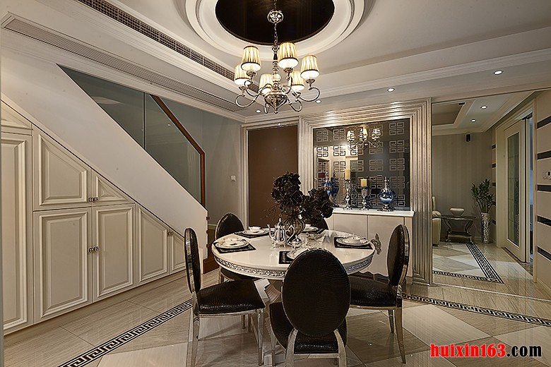 本套餐厅装饰中空间内的色彩搭配主要是以黑白两色为主,石膏板吊顶上安装了一盏银灰色的金属吊灯,在白色的背景下吊灯显得更加具有时尚气息,同时也将整个餐厅显得更加华美。