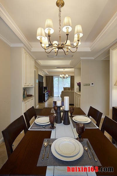 北美风格的居室装修中会有强烈的自然气息,无拘无束的设计最受年轻人追捧,偶尔个性化的装饰也并不会使装饰显得突兀,反而是为空间装饰增添了一份设计感,装饰的整体效果也会因此而显得十分精致。 本套餐厅装饰中空间内的色彩搭配主要是以黑白两色为主,石膏板吊顶上安装了一盏银灰色的金属吊灯,在白色的背景下吊灯显得更加具有时尚气息,同时也将整个餐厅显得更加华美。 更多»推荐家装效果图