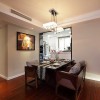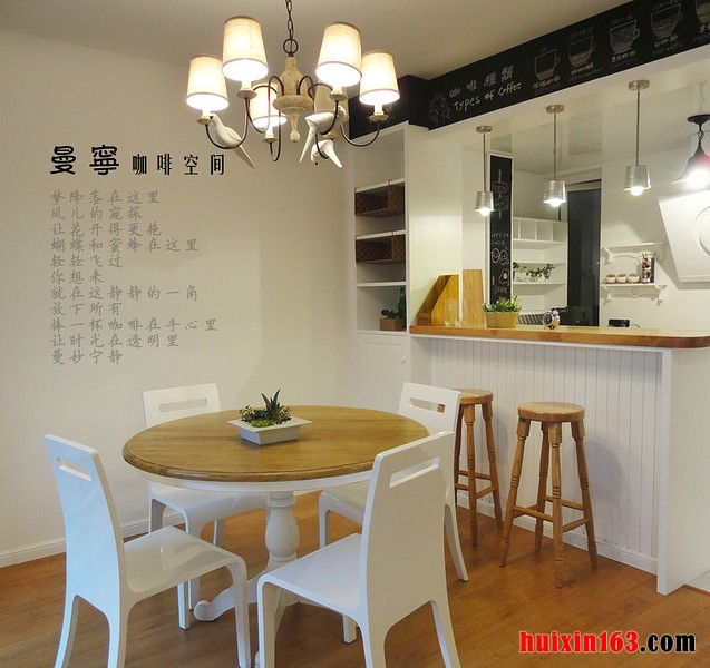 本套餐厅装饰中空间内的色彩搭配主要是以白色为主,石膏板吊顶的设计为了凸显出吊灯做了凹槽设计,黑色的铁艺吊灯也因此显得更加精致,也凸显出了独特的设计感,下方原本朴素的餐桌也因此而显得更加唯美。