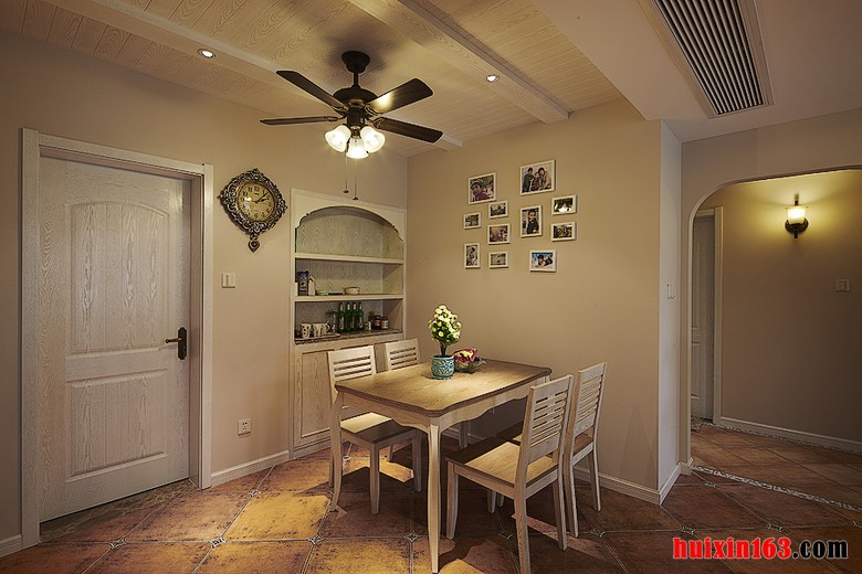 美式田园风格的居室装修会将墙壁作为装饰的重点,墙壁的装饰材料主要是以壁纸为主,清新淡雅的色彩搭配上细小精致的花纹图案,可以使整个空间的装饰都显得十分温馨,可以更加凸显美式田园风格的装饰特点。 本套餐厅装饰中空间内的装饰比较简洁,石膏板吊顶的设计主要是以平顶式为主,中间一盏金属吊灯因此显得更加别致,下方的实木餐桌也在其他装饰的衬托下显得更加高档。 更多»推荐家装效果图