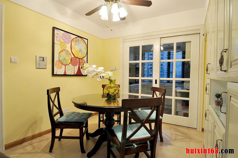 美式田园风格的居室内最好可以有一扇宽大的落地窗,明亮的杨过透过玻璃打在室内的墙壁上,在结合室内温馨的装饰自然会带给人们一种难以抗拒的舒适感,空间内的装饰最好以简约为主,这样会显得更加大气。 本套餐厅装饰中空间内的色彩搭配比较柔和,造型设计的也比较简洁,装饰的整体效果可以带给人们一种大气感,但仔细观察空间内部的细节处理,又会感受到一丝精美与别致。 更多»推荐家装效果图