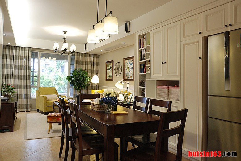 美式田园风格的居室内最好可以有一扇宽大的落地窗,明亮的杨过透过玻璃打在室内的墙壁上,在结合室内温馨的装饰自然会带给人们一种难以抗拒的舒适感,空间内的装饰最好以简约为主,这样会显得更加大气。 本套餐厅装饰中空间内的色彩搭配比较柔和,造型设计的也比较简洁,装饰的整体效果可以带给人们一种大气感,但仔细观察空间内部的细节处理,又会感受到一丝精美与别致。 更多»推荐家装效果图