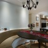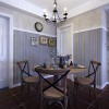 本套餐厅装饰的整体效果可以带给人们一种典雅的感觉,空间内的石膏板吊顶采用了圆形的设计,中间做了凹槽处理,可以使中间的铁艺吊灯显得更加别致,并附有个性,下方实木餐桌也因此而显得更加具有古典气息。