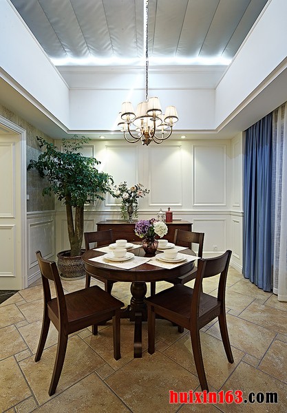 美式田园风格的装饰中空间内的主色调是影响装饰效果的主要原因,一般比较常见的色系多以黄色、绿色以及土褐色为主,整体可以营造出一种自然的气息,在搭配上设计简洁的家具,更是也可以营造出舒适的氛围。 本套餐厅装饰的整体效果可以带给人们一种典雅的感觉,空间内的石膏板吊顶采用了圆形的设计,中间做了凹槽处理,可以使中间的铁艺吊灯显得更加别致,并附有个性,下方实木餐桌也因此而显得更加具有古典气息。 更多»推荐家装效果图