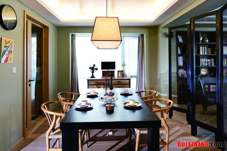 本套餐厅装饰的整体效果会带有一丝古典的气息,空间内的家具主要是以实木材质为主,搭配上素雅的桌布更是可以将装饰的设计感全部都展现出来,餐桌上一束清新淡雅的花束摆放在中间,更是为装饰增添了亮点。