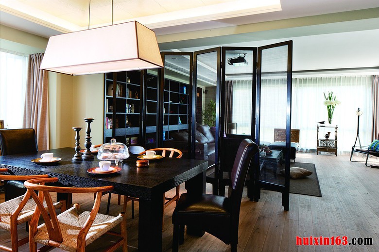 本套餐厅装饰的整体效果会带有一丝古典的气息,空间内的家具主要是以实木材质为主,搭配上素雅的桌布更是可以将装饰的设计感全部都展现出来,餐桌上一束清新淡雅的花束摆放在中间,更是为装饰增添了亮点。