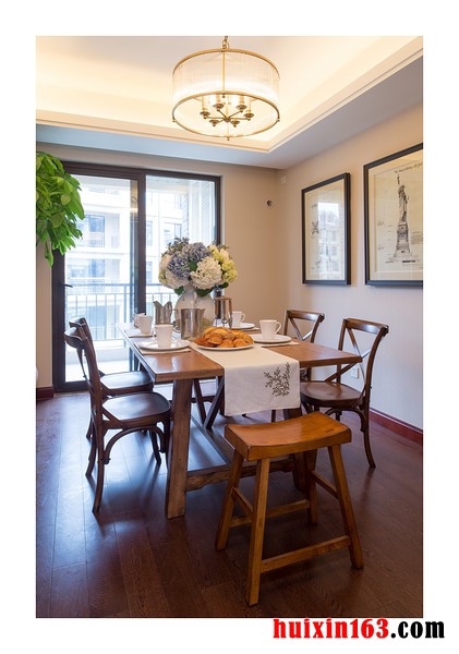 本套餐厅装饰的整体效果会带有一丝古典的气息,空间内的家具主要是以实木材质为主,搭配上素雅的桌布更是可以将装饰的设计感全部都展现出来,餐桌上一束清新淡雅的花束摆放在中间,更是为装饰增添了亮点。