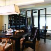 本套餐厅装饰的整体效果会带有一丝古典的气息,空间内的家具主要是以实木材质为主,搭配上素雅的桌布更是可以将装饰的设计感全部都展现出来,餐桌上一束清新淡雅的花束摆放在中间,更是为装饰增添了亮点。