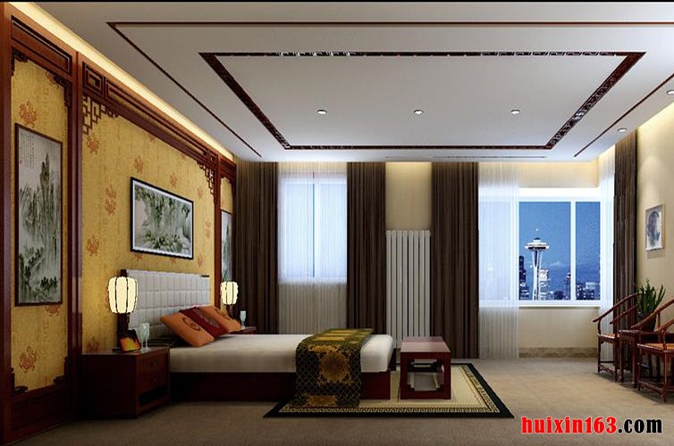 卧室设计温馨,空间利用色彩协调搭配,古典吊顶的材质和色调统一,突出浓厚的文化氛围和格调感,融合庄重与优雅的双重气质,把传统的结构形式通过古典的韵味来体现出来,体现业主对生活品味追求。