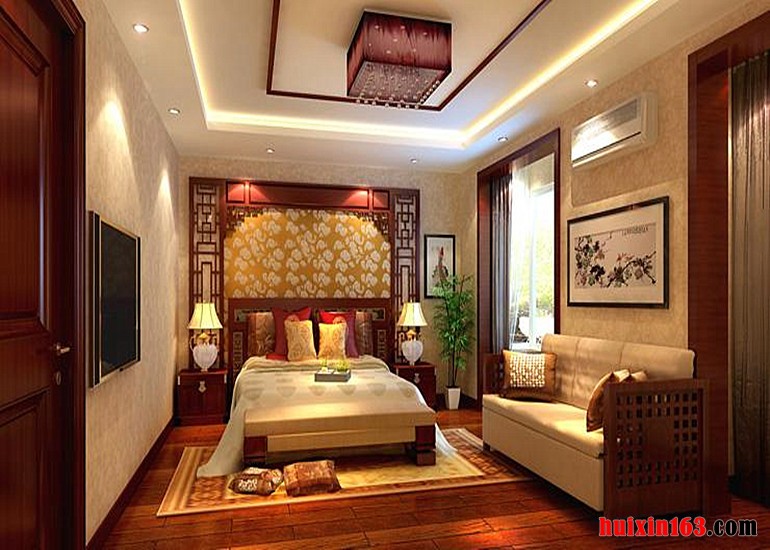 卧室设计温馨,空间利用色彩协调搭配,古典吊顶的材质和色调统一,突出浓厚的文化氛围和格调感,融合庄重与优雅的双重气质,把传统的结构形式通过古典的韵味来体现出来,体现业主对生活品味追求。