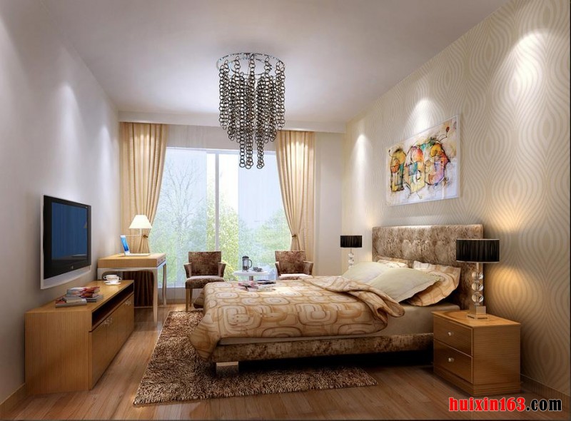 卧室一个需要身体和心灵休憩的地方, 需要的是宁静安谧。因此摒弃了繁华的造型,一圈石膏线点缀空间。深色的床头背景壁纸,让人增加安全感。壁挂电视使卧室不在无聊!