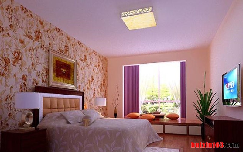 卧室一个需要身体和心灵休憩的地方, 需要的是宁静安谧。因此摒弃了繁华的造型,一圈石膏线点缀空间。深色的床头背景壁纸,让人增加安全感。壁挂电视使卧室不在无聊!