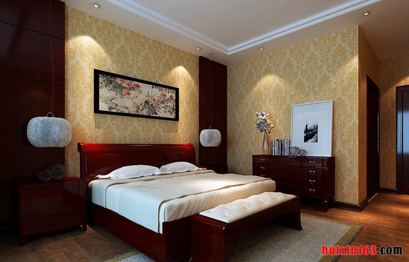 卧室吊顶以增加居室层次感而存在,石膏板吊顶与适当的实木线条配合,配以简约的布艺床,带给人温馨的家的感觉,增加居室古朴感,绿色的植物加以点缀增加一份风雅。家具的选择,依然选择布艺沙发,避免带给人硬朗的感觉。