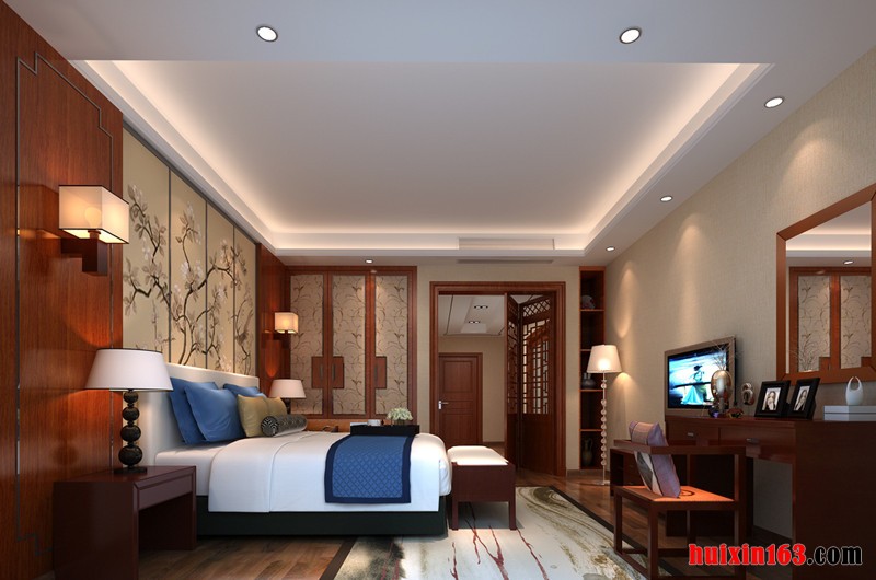 本套为古典风格装修,卧室以吊顶的图画风格相得益彰。画质细腻,搭配手法多样,让人印象深刻,空间无论在材质,线条,色彩搭配上都让居室散发着中式古典的魅力,整体给人一种自然、典雅、高贵的气度。