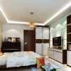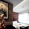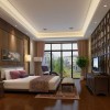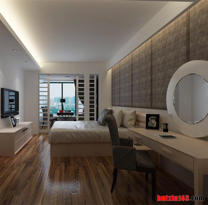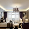 卧室石膏吊顶上的花格灯带,使空间具有延伸感,虽然墙面造型复杂但地面、顶面简单 ,整体感觉很舒服。室内多采用对称式的布局方式,格调高雅,造型简朴优美。空间方正、对称,造型朴素大方,明快色调空间求稳重。用现代材料表现古朴的文化底蕴。