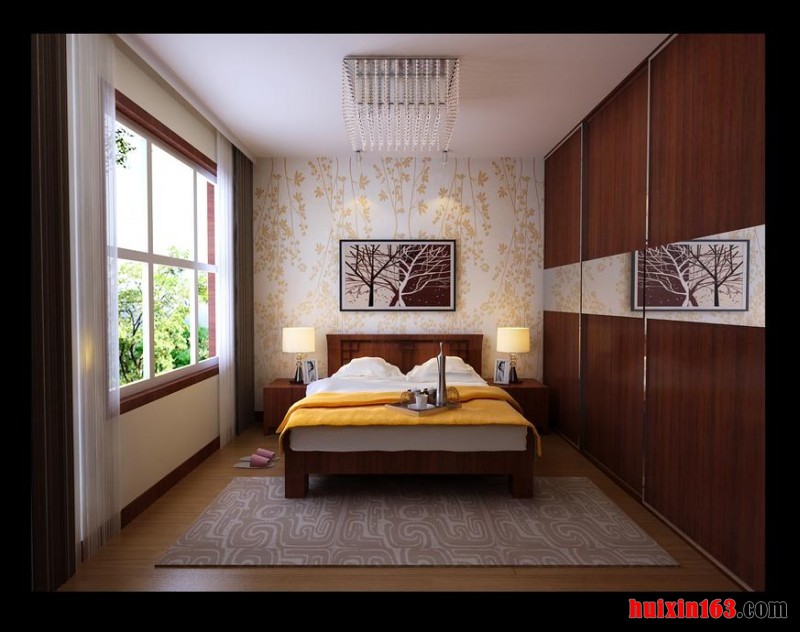 卧室石膏吊顶上的花格灯带,使空间具有延伸感,虽然墙面造型复杂但地面、顶面简单 ,整体感觉很舒服。室内多采用对称式的布局方式,格调高雅,造型简朴优美。空间方正、对称,造型朴素大方,明快色调空间求稳重。用现代材料表现古朴的文化底蕴。