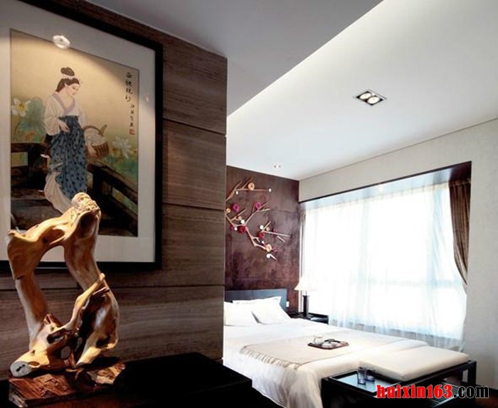 卧室石膏吊顶上的花格灯带,使空间具有延伸感,虽然墙面造型复杂但地面、顶面简单 ,整体感觉很舒服。室内多采用对称式的布局方式,格调高雅,造型简朴优美。空间方正、对称,造型朴素大方,明快色调空间求稳重。用现代材料表现古朴的文化底蕴。