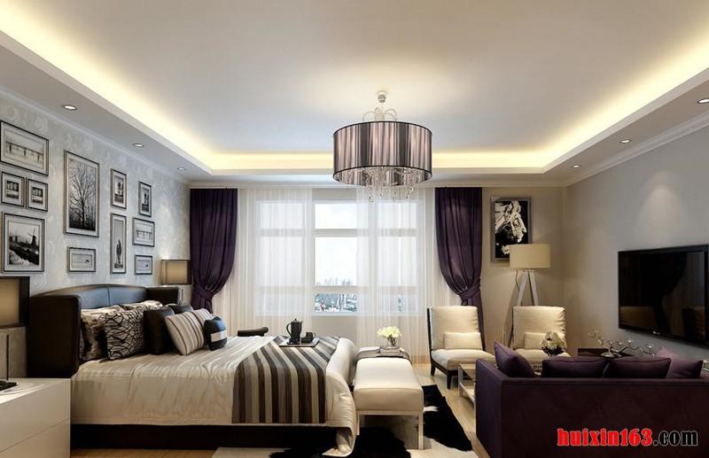 卧室石膏吊顶上的花格灯带,使空间具有延伸感,虽然墙面造型复杂但地面、顶面简单 ,整体感觉很舒服。室内多采用对称式的布局方式,格调高雅,造型简朴优美。空间方正、对称,造型朴素大方,明快色调空间求稳重。用现代材料表现古朴的文化底蕴。