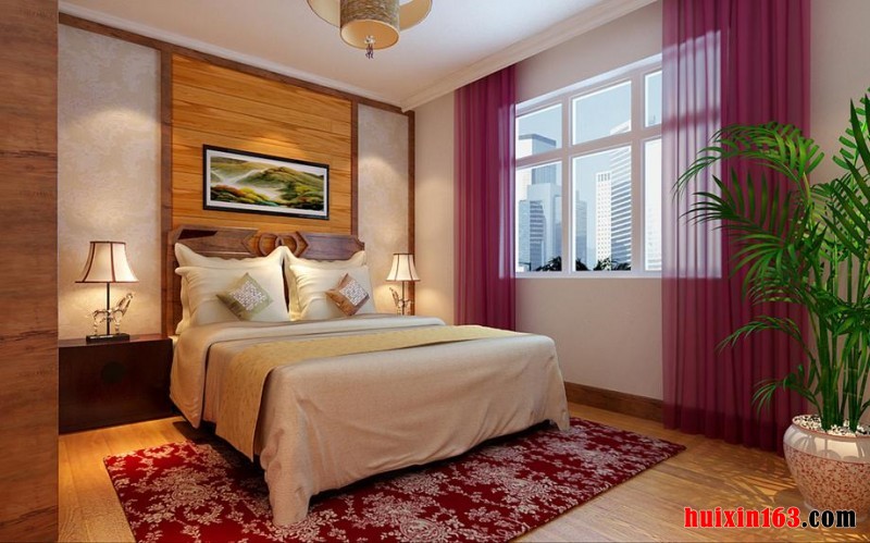 卧室石膏吊顶上的花格灯带,使空间具有延伸感,虽然墙面造型复杂但地面、顶面简单 ,整体感觉很舒服。室内多采用对称式的布局方式,格调高雅,造型简朴优美。空间方正、对称,造型朴素大方,明快色调空间求稳重。用现代材料表现古朴的文化底蕴。