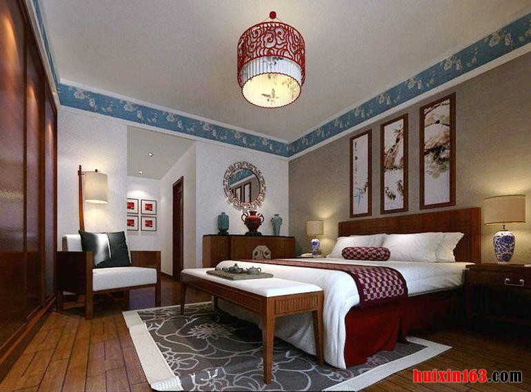 卧室石膏吊顶上的花格灯带,使空间具有延伸感,虽然墙面造型复杂但地面、顶面简单 ,整体感觉很舒服。室内多采用对称式的布局方式,格调高雅,造型简朴优美。空间方正、对称,造型朴素大方,明快色调空间求稳重。用现代材料表现古朴的文化底蕴。