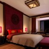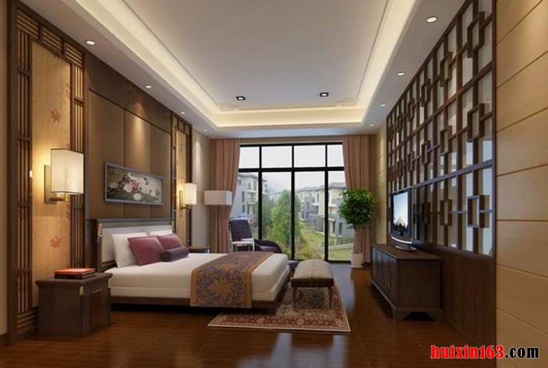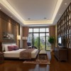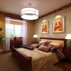 房间内的家具都是使用实木做的,在一些装饰的上面也使用了大量的木材,卧室内吊顶中间就是使用木材做的造型,吊顶的中间安装了一个造型比较华丽的吊灯,看着非常的干练有型,电视安装在一个圆的造型中,电视的下面是一个电视柜,电视柜上的浮雕是比较大气的,墙面使用的是涂料装饰,在墙面上挂了一幅山水画,让人心胸开阔。卧室床头使用的是软包,空间用简洁的线条做装饰,使屋子简单大方。 更多»推荐家装效果图