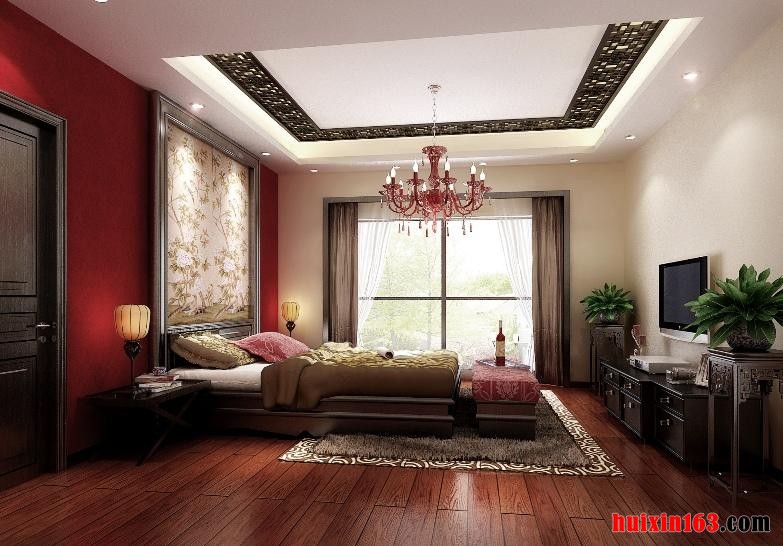 房间内的家具都是使用实木做的,在一些装饰的上面也使用了大量的木材,卧室内吊顶中间就是使用木材做的造型,吊顶的中间安装了一个造型比较华丽的吊灯,看着非常的干练有型,电视安装在一个圆的造型中,电视的下面是一个电视柜,电视柜上的浮雕是比较大气的,墙面使用的是涂料装饰,在墙面上挂了一幅山水画,让人心胸开阔。卧室床头使用的是软包,空间用简洁的线条做装饰,使屋子简单大方。
