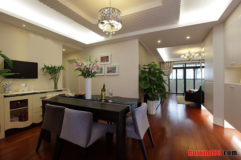 本套餐厅装饰中空间内的色调搭配比较柔和,白色以及黄色的搭配可以使整个空间都显得十分柔美、温馨,平顶式的石膏板吊顶可以将铁艺吊灯衬托的更加别致,也可以将本套餐厅设计的亮点凸显出来。