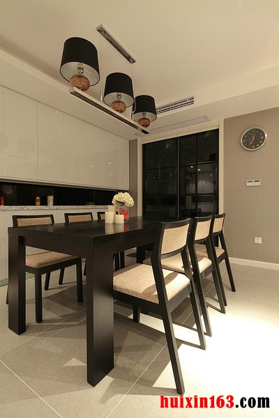 本套餐厅装饰中空间内的主色彩是以白色为主,一款黑色的餐桌搭配上座椅更是可以凸显出一种艺术气息,简单的造型设计却在白色的背景下显得十分具有设计感,餐桌上一款红色的布艺桌旗更是将空间内的所有亮点都集于一身。