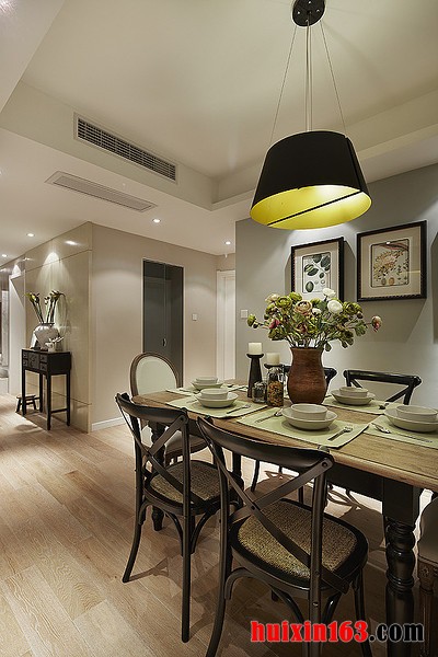 本套餐厅装饰中空间内的主色彩是以白色为主,一款黑色的餐桌搭配上座椅更是可以凸显出一种艺术气息,简单的造型设计却在白色的背景下显得十分具有设计感,餐桌上一款红色的布艺桌旗更是将空间内的所有亮点都集于一身。