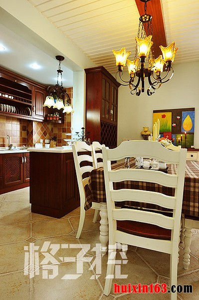 本套餐厅装饰可以带给人们一种自然的清新感,空间内的装饰材料主要是以木质为主,并没有过多的造型设计,却可以将一种自然气息显露无疑,格子图案的桌布更是将质感彰显到了极致。
