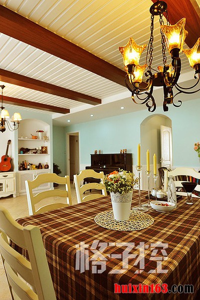本套餐厅装饰可以带给人们一种自然的清新感,空间内的装饰材料主要是以木质为主,并没有过多的造型设计,却可以将一种自然气息显露无疑,格子图案的桌布更是将质感彰显到了极致。