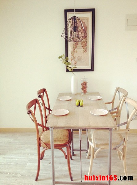 本套餐厅装饰中空间内的色彩搭配主要是以白色为主,造型简约的实木餐桌上搭配了一款白色素雅的桌布,整体的色调与款式与空间装饰的主题十分搭调,桌面上一款金属花瓶在空间内起到了一定的点缀效果,增添了空间装饰的设计感。