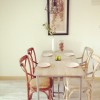 本套餐厅装饰中空间内的色彩搭配主要是以白色为主,造型简约的实木餐桌上搭配了一款白色素雅的桌布,整体的色调与款式与空间装饰的主题十分搭调,桌面上一款金属花瓶在空间内起到了一定的点缀效果,增添了空间装饰的设计感。