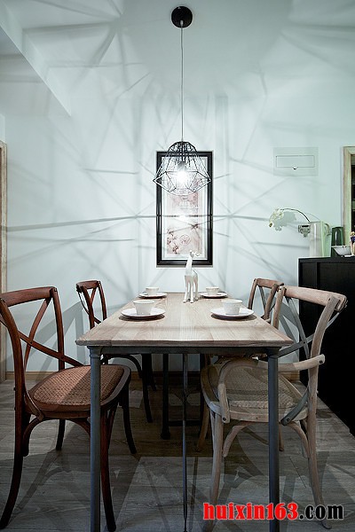 本套餐厅装饰中空间内的色彩搭配主要是以白色为主,造型简约的实木餐桌上搭配了一款白色素雅的桌布,整体的色调与款式与空间装饰的主题十分搭调,桌面上一款金属花瓶在空间内起到了一定的点缀效果,增添了空间装饰的设计感。