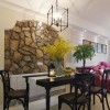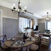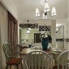 本套餐厅装饰中空间内的色彩搭配比较柔和也很素净,平顶式的石膏板吊顶带来一丝大气感,中间一款黑色铁艺吊灯因此显得更加精致,也多了一丝唯美之意,下方的实木餐桌搭配上白色的座椅更是可以凸显出一种时尚的设计感。