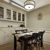 本套餐厅装饰中空间内的色彩搭配比较柔和也很素净,平顶式的石膏板吊顶带来一丝大气感,中间一款黑色铁艺吊灯因此显得更加精致,也多了一丝唯美之意,下方的实木餐桌搭配上白色的座椅更是可以凸显出一种时尚的设计感。