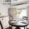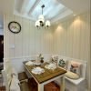 本套餐厅装饰中空间内的色彩搭配比较柔和也很素净,平顶式的石膏板吊顶带来一丝大气感,中间一款黑色铁艺吊灯因此显得更加精致,也多了一丝唯美之意,下方的实木餐桌搭配上白色的座椅更是可以凸显出一种时尚的设计感。