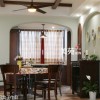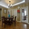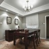 本套餐厅装饰中石膏板吊顶的设计比较具有设计感,平顶式的吊顶原本平淡无奇,但搭配上装饰木条后,显得十分具有设计感,在搭配上中间那款水晶吊灯,更是可以使整个空间都显得十分唯美。