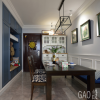 本套餐厅装饰中蓝色的墙壁十分吸引人,靓丽的色彩搭配上极具设计感的装饰画,整体可以营造出一种唯美、华丽的感觉,石膏板吊顶的设计采用了凹槽的设计可以将铁艺吊灯衬托的更加富有个性,也比较复合本套餐厅装饰的主题。