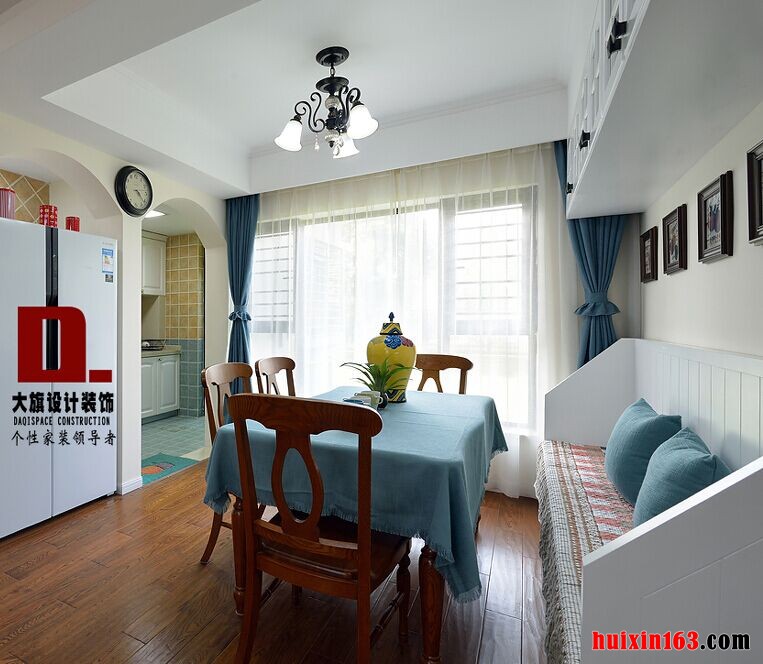 本套餐厅装饰中蓝色的墙壁十分吸引人,靓丽的色彩搭配上极具设计感的装饰画,整体可以营造出一种唯美、华丽的感觉,石膏板吊顶的设计采用了凹槽的设计可以将铁艺吊灯衬托的更加富有个性,也比较复合本套餐厅装饰的主题。