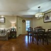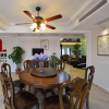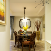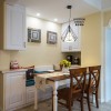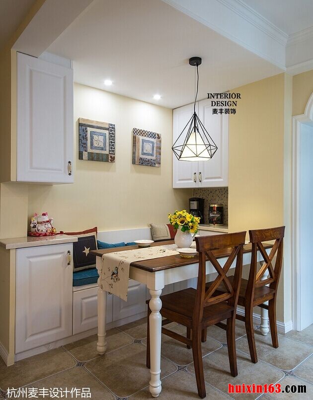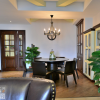 本套餐厅装饰比较具有趣味,空间内的整体装饰十分具有时尚气息,平顶式的吊灯搭配上一款黑色的铁艺吊灯,可以将整体的设计感全部都凸显出来,下方的实木餐桌上搭配了一款白色素雅的桌旗更为餐厅空间平添了一份唯美。