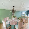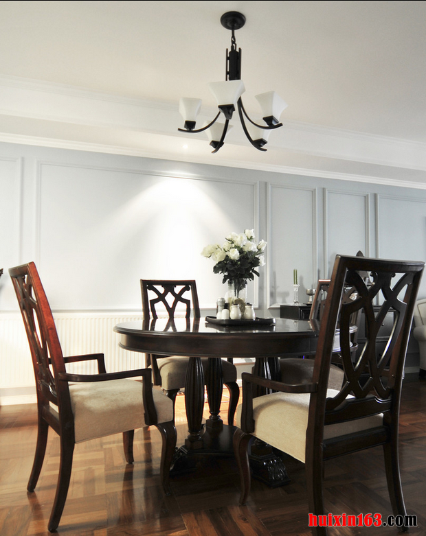本套餐厅装饰比较具有趣味,空间内的整体装饰十分具有时尚气息,平顶式的吊灯搭配上一款黑色的铁艺吊灯,可以将整体的设计感全部都凸显出来,下方的实木餐桌上搭配了一款白色素雅的桌旗更为餐厅空间平添了一份唯美。