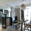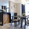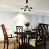 本套餐厅装饰比较具有趣味,空间内的整体装饰十分具有时尚气息,平顶式的吊灯搭配上一款黑色的铁艺吊灯,可以将整体的设计感全部都凸显出来,下方的实木餐桌上搭配了一款白色素雅的桌旗更为餐厅空间平添了一份唯美。