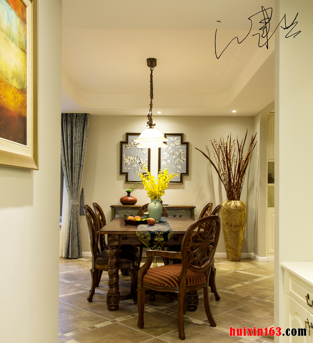 本套餐厅装饰比较具有趣味,空间内的整体装饰十分具有时尚气息,平顶式的吊灯搭配上一款黑色的铁艺吊灯,可以将整体的设计感全部都凸显出来,下方的实木餐桌上搭配了一款白色素雅的桌旗更为餐厅空间平添了一份唯美。