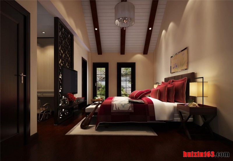 卧室加之电视背景墙和古典元素和壁画的点缀,让风格的混搭与家庭年代的层次感完美结合。古典花格与绿植巧妙搭配电视柜,不落于俗,稳重气息的床大气不失品味。