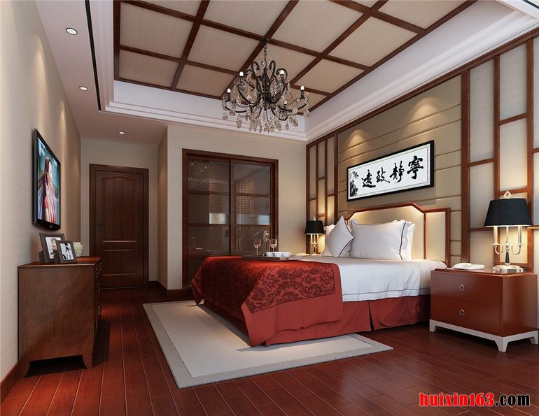 卧室采用实木装饰凹位造型吊顶,实木线勾边,古风浓郁,儒雅隽美。让原本简约大方的吊顶呈现出质朴的古感,花灯式吊灯悬挂在卧室吊顶中央,在灯光的照射下,还能给人温馨祥和之感烘托出了浓厚的古典风情。