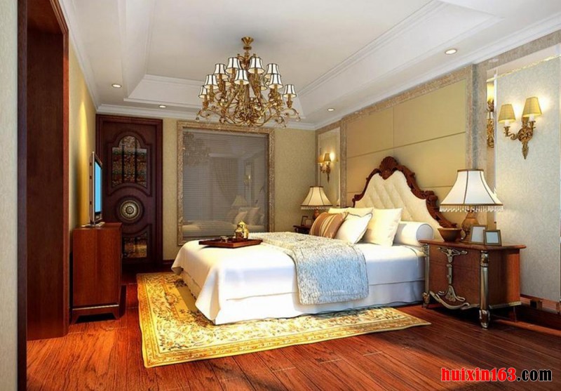 卧室采用实木装饰凹位造型吊顶,实木线勾边,古风浓郁,儒雅隽美。让原本简约大方的吊顶呈现出质朴的古感,花灯式吊灯悬挂在卧室吊顶中央,在灯光的照射下,还能给人温馨祥和之感烘托出了浓厚的古典风情。
